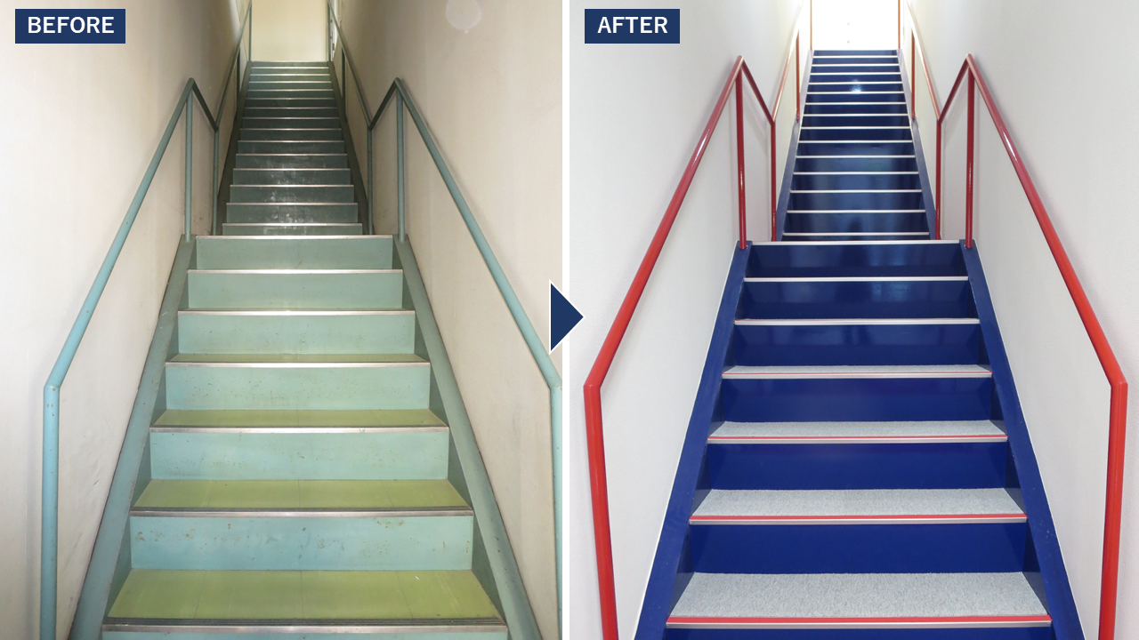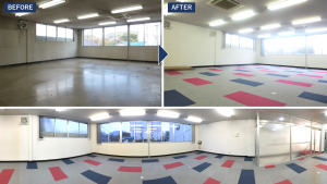 フロアの床をタイル張りからカーペットタイルへ改装いたしました。